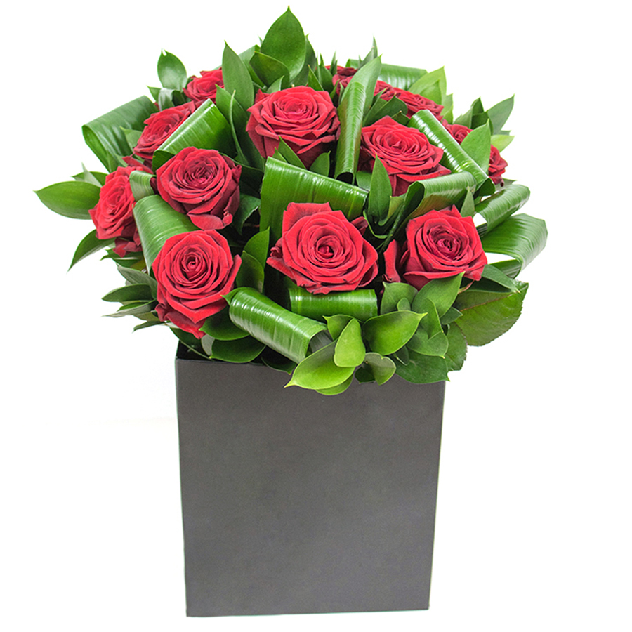 Indulge in the opulent beauty of our red rose bouquet, featuring hand-selected roses, fresh aspidistra leaves, and elegant ruscus. This unique design exudes luxury and sophistication, perfect for any special occasion.